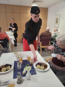 Unsere Auszubildenden zeigten ihre Kreativität, kochten mit Herz und begeisterten die Bewohner mit einem festlichen Menü. Ein Tag, der die Leidenschaft und das Potenzial des Nachwuchses in der Küche perfekt widerspiegelte. Für Stephan (22), der gerade seine Ausbildung abgeschlossen hat, war der Tag ein doppelter Grund zur Freude: Er startet nun als Trainee in unseren Küchen und freut sich auf die vielfältigen Erfahrungen. „Hier bekomme ich die Möglichkeit, mich weiterzuentwickeln“, sagt er.